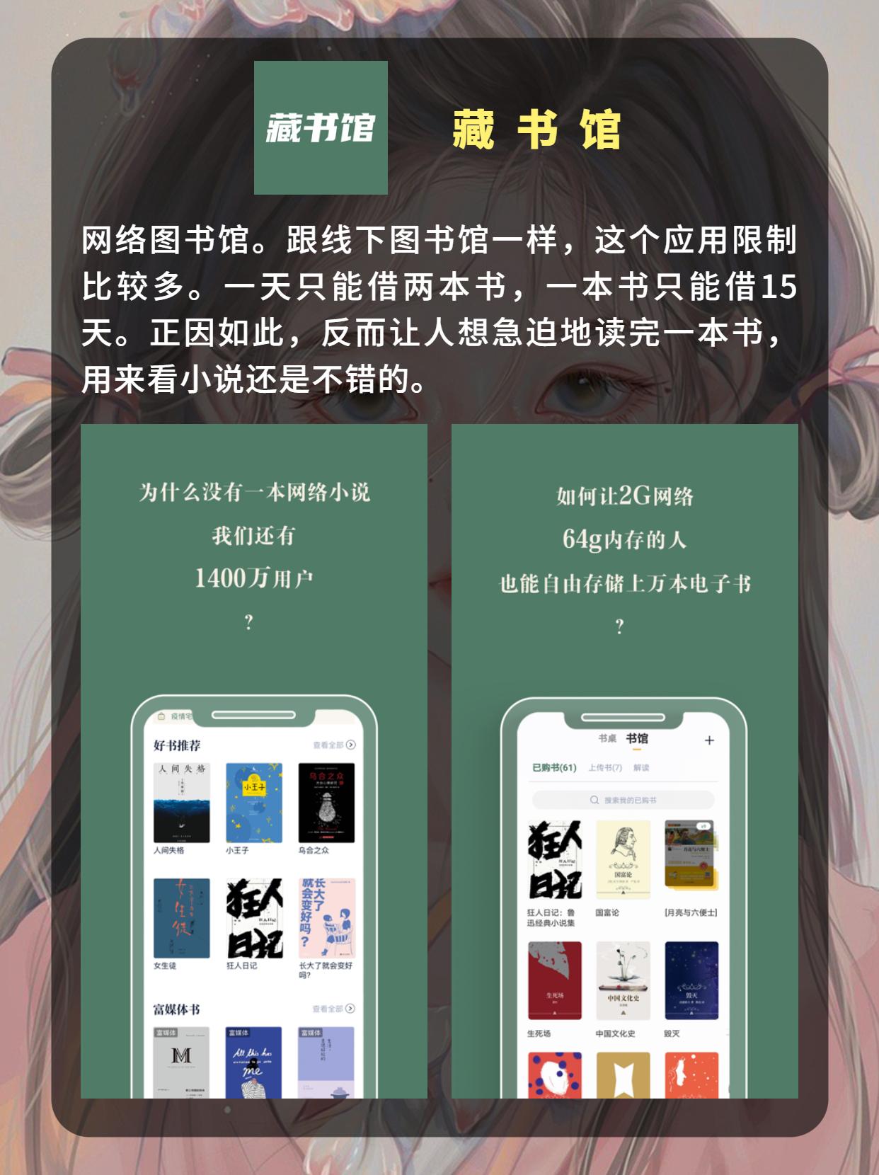 网络图书馆。跟线下图书馆一样,这个应用限制比较多。一天只能借两本书,一本书只能借15天。正因如此,反而让人想急迫地读完一本书,用来看小说还是不错的。