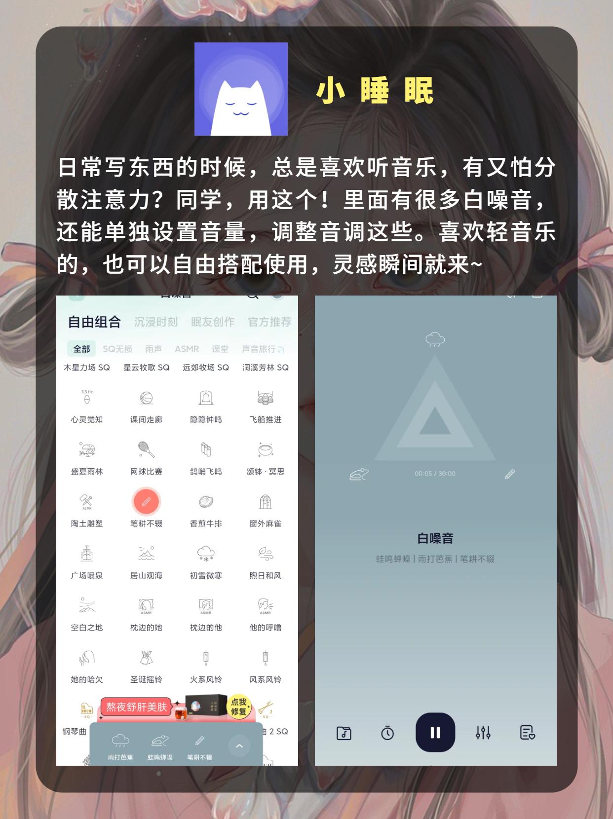 日常写东西的时候,总是喜欢听音乐,又怕分散注意力?同学,用这个!里面有很多白噪音,还能单独设置音量,调整音调。喜欢轻音乐的,也可以自由搭配使用,灵感瞬间就来~