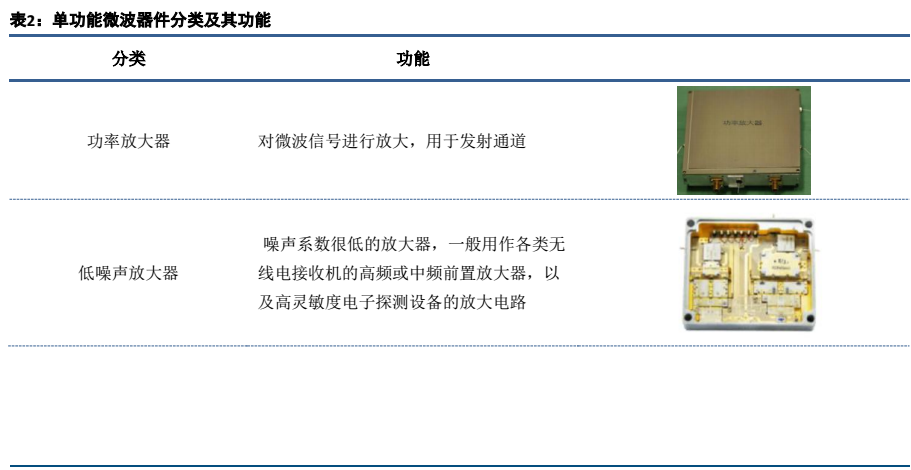单功能微波器件用于实现对微波信号的单一处理功能,如放大、检测、功率分配/合成、混频、滤波、耦合等功能;按照传输线类型分可分为波导型、同轴型和微带型微波器件,其中微带电路在平面实现,具有结构紧凑、体积小、重量轻、造价低等优点。