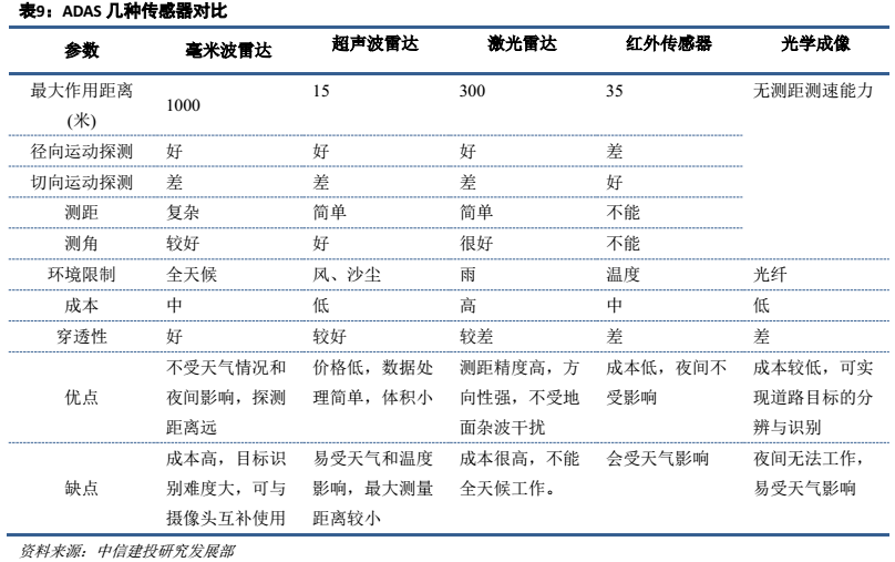ADAS 用到的主要传感器包括摄像头、雷达等,其中雷达包括毫米波雷达和激光雷达两大类。毫米波雷达分为远距离雷达(LRR)和近距离雷达(SRR),由于毫米波在大气中衰减弱,所以可以探测感知到更远的距离,其中远距离雷达可以实现超过200m的感知与探测。毫米波雷达的多项优势,使其目前在汽车防撞传感器中占比较大,根据 IHS的数据,毫米波/微波雷达+摄像头在汽车防撞传感器中占比达到了70%。同超声波雷达相比,毫米波雷达具有体积小、质量轻和空间分辨率高的特点。与红外、激光、摄像头等光学传感器相比,毫米波雷达穿透雾、烟、灰尘的能力强,具有全天候全天时的特点。另外,毫米波雷达的抗干扰能力也优于其他车载传感器。