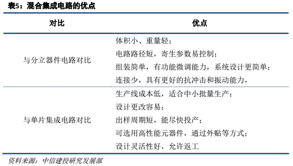 混合集成电路包括厚膜混合集成电路、薄膜混合集成电路。厚膜混合集成电路是以绝缘基片作为电路的基板,先把导体网络及阻、容等元件采用丝网漏印、等离子喷涂等工艺印于基板表面,再把其他元器件(包括集成电路、传感器其他功能元件等)组装在陶瓷基板上,连接输出引脚,最后作整体封装,形成一个功能完整的电路产品。混合集成电路也可以看作是对半导体集成电路的二次集成,也是实现微波组件小型化的重要手段,相比单片集成电路具有成本低、周期短、设计灵活等优点。