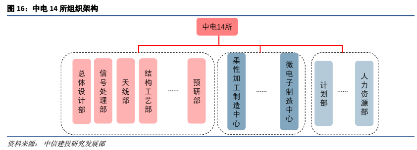 我国主要的雷达、导引头、电子对抗等相关研制单位均有一定微波组件研制生产能力。以中电14所为例,14所的组织架构可以分为多个研发部门、生产部门以及管理部门,其中研发部门包括总体设计部、系统部、信号处理部、天线部、结构工艺部以及预研部等;生产部门包括柔性加工制造中心、微电子制造中心等,其中微电子制造中心主要从事微波组件的生产,主要为微波电路、T/R组件生产线,拥有完整的厚膜、薄膜、LTCC工艺生产线和表面组装生产线,可以生产大部分所需要的微波组件,但部分上游产品仍然需要外购。