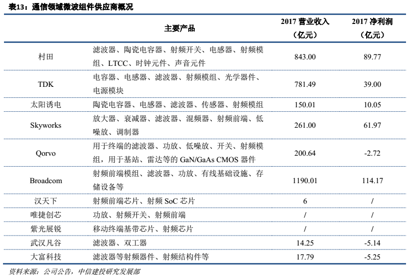 在无线通信的移动终端领域,微波组件中滤波器、功放、射频开关占据主要市场,其中滤波器的主要供应商为村田、TDK、太阳诱电、Skyworks、Qorvo、博通等,国内滤波器的供应商包括麦捷科技、德清华莹和好达电子等;功放市场绝大部分份额被 Skyworks、Qorvo、Broadcom占据,前三者市占率达92%,国内设计公司有近20家,主要有汉天下、唯捷创芯、紫光展锐、中普微等,国内晶圆代工厂商主要有三安光电、海特高新。集成化可以降低成本、提高性能,未来射频前端集成化是必然趋势,Broadcom、Qorvo、Skyworks、村田、TDK不仅供应元器件还具有模组整合能力,将在集中度很高的市场中进一步确立优势。另外,随着基带厂商也进入射频前端领域,行业竞争更加激烈。