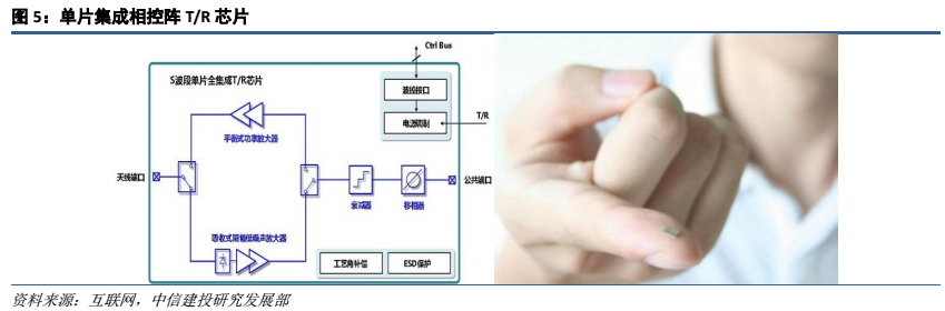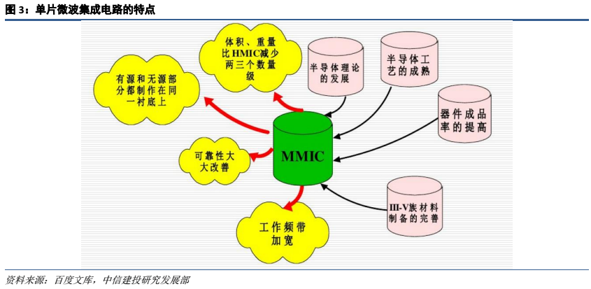 单片微波集成电路是在半绝缘半导体衬底上用一系列的半导体工艺方法制造出无源和有源元器件,并连接起来构成应用于微波频段的功能电路,它包括多种功能电路,如低噪声放大器(LNA)、功率放大器、混频器、上变频器、检波器、调制器、压控振荡器(VCO)、移相器、开关、MMIC收发前端,甚至整个T/R组件。由于MMIC的衬底材料(如GaAs、InP)的电子迁移率较高、禁带宽度宽、工作温度范围大、微波传输性能好,所以 MMIC具有电路损耗小、噪声低、频带宽、动态范围大、功率大、附加效率高、抗电磁辐射能力强等特点。单片微波集成电路可比混合微波集成电路减小两三个数量级。