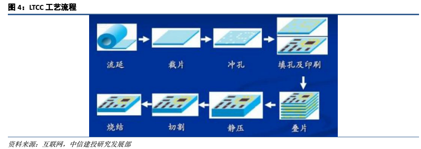 实现小型化的一个重要手段就是高密度封装,LTCC 3D 封装可提升微波电路布线密度,打破微波信号在常规平面混合集成电路中沿平面传播的限制,实现在多层基板之间的纵向传输,可有效缩小微波电路尺寸。LTCC英文全称是 Low-Temperature Cofired Ceramics,中文名称为低温共烧陶瓷,以陶瓷材料作为电路的介质层,将低容值电容、电阻、阻抗转换器、滤波器、耦合器等被动元件内埋入陶瓷基板中,应用金、银、铜等金属当作内外层电极,采用丝网印刷技术涂布电路,在低于900℃的烧结炉中烧结而成。