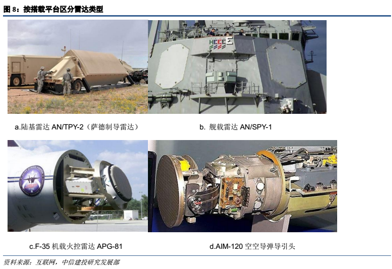 我国各大军工集团雷达相关研究所的分工基本上是按照搭载平台来区分的。按搭载平台分类,雷达可分为陆基雷达、舰载雷达、机载雷达、弹载雷达、星载雷达五类。除陆基雷达之外,其余雷达数量均受所搭载平台的数量限制。