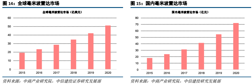 2015 年全球毫米波汽车雷达市场规模约为19.4 亿美元,预计2018 年将达 34.7 亿美元,到 2020 年全球毫米波雷达市场规模将超50 亿美元。随着国内汽车消费结构升级,无人驾驶汽车市场需求扩大,国内毫米波雷达前后装市场需求爆发式增长。据统计数据显示,2015年中国毫米波雷达市场规模约为18亿元,预计2018年将达 41.4亿元,到2020年中国毫米波雷达或将超72.1亿元。
