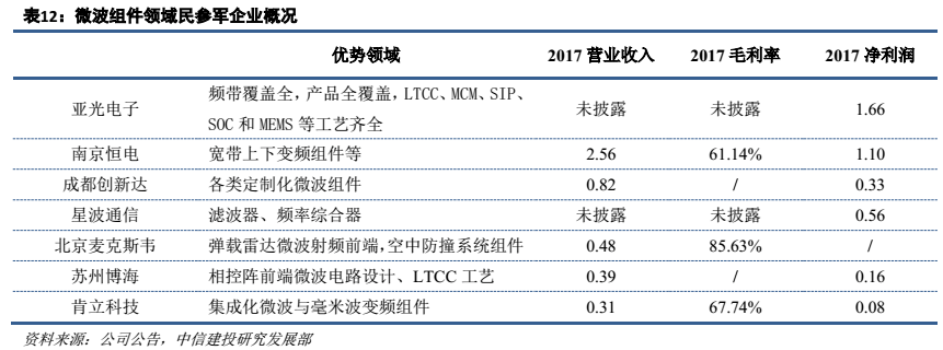 民营企业一般对应的客户范围较窄,收入规模相对较小。从事微波组件相关业务的民营企业包括亚光电子(亚光科技子公司)、南京恒电(盛路通信子公司)、成都创新达(盛路通信子公司)、星波通信(红相股份子公司)、北京麦克斯韦(景嘉微子公司)、苏州博海(雷科防务子公司)、肯立科技、南京誉葆、成都雷电微力等。