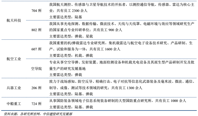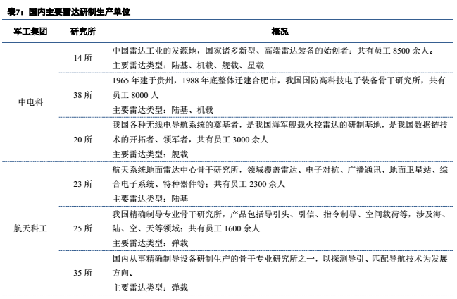 我国雷达研制单位主要集中在各大军工集团。其中规模排名前两位的是中电科集团的 14所和 38所,14所是我国最大的雷达研究所,涵盖陆海空天各类平台的雷达装备,综合实力最强。其余还包括航天科工的23所、25所和35所,航天科技的704所、802所,中航工业的607所,中船重工的724所以及兵器工业的206所等。