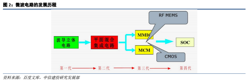 微波组件小型化是实现高性能、高可靠性和低成本的重要途经。自 20世纪 40年代起第一代立体微波电路以来,经历了四代产品,包括波导立体电路、平面混合集成电路、 MMIC、SOC,集成度越来越高。目前常用的主要为中间两代产品:混合微波集成电路(HMIC )和单片微波集成电路(MMIC )。