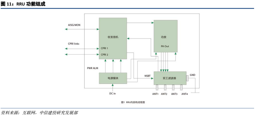 RRU 分为中频模块、收发信机模块、功放和滤波模块四大模块。数字中频模块用于光传输的调制解调、数字上下变频、数模转换(A/D & D/A)等;收发信机模块完成中频信号到射频信号的变换;功放和滤波模块将射频信号放大、滤波后通过天线口发射出去。