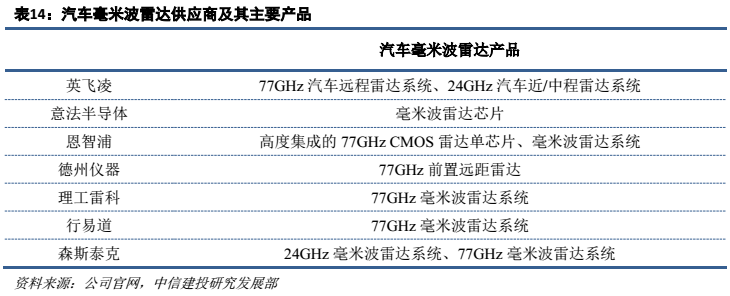 在汽车毫米波雷达领域,毫米波雷达的关键技术依然被传统汽车零部件公司的典型代表“ABCD”公司等巨头垄断,“ABCD”公司分别指的是奥托立夫Autoliv、博世Bosch、大陆 Continetal、德尔福Dephi,其中Autoliv占据 15~20%的市场份额。而前端单片微波集成电路作为毫米波雷达的关键部件,也仅掌握在英飞凌、意法半导体、恩智浦/飞思卡尔、德州仪器等少数国外芯片厂商手中。目前国内的理工雷科、行易道、森斯泰克等很多企业已经逐步实现 77GHz毫米波雷达的量产,开始和国内整车厂展开合作,并占有了部分国内市场份额。