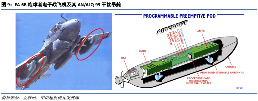 电子对抗设备主要包括电子侦察设备、电子干扰设备等类型。电子侦察用于战略战术电子情报搜集、辐射源目标精确识别、测向与定位,战时可用于战场监视及打击引导,主要以侦察吊舱的形式装载于侦察飞机、无人机等,典型代表包括美国的 RC-135战略侦察机,该飞机上的雷达技术侦察系统可以收集预警、制导和引导雷达的频率等技术参数,并对其进行定位,世界上各种雷达参数都在其测量范围内,其测量精度相当高,测量脉冲的宽度可精确到±0.1um、方位可精确到±1°。电子干扰设备主要搭载在专用电子战飞机以及各类作战飞机上,前者用于实施电子进攻,后者主要用于自卫。电子战飞机搭载各类干扰吊舱对敌方实施防空压制、随队干扰等电子支援任务,机载自卫电子装备主要由侦察告警接收机、拖曳式诱饵等组成。