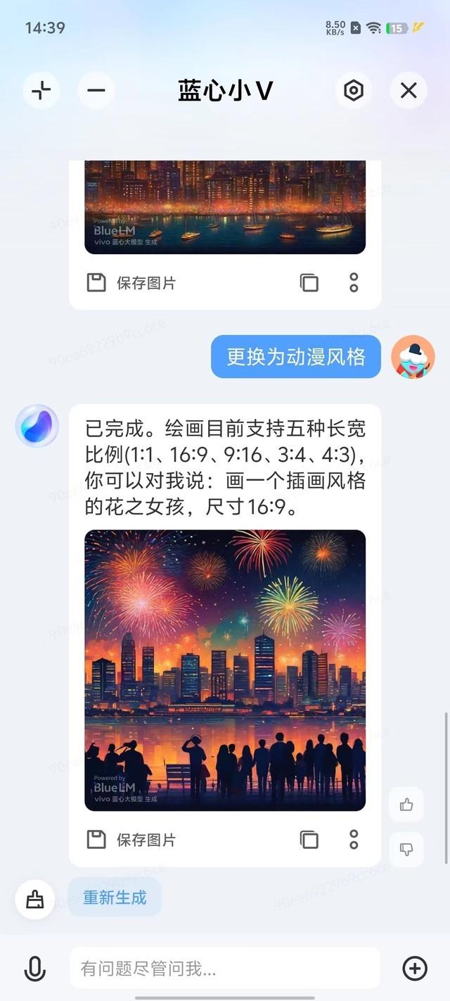 vivo系手机搭载的OriginOS语音助手是Jovi,用“小V小V”称呼就能唤出。值得一提的是,iQOO Neo9 Pro等最新发布的机型内置了蓝心大模型,支持文字、图片语义生成,比如我让它画出一张“城市中放烟花”的照片,手机能在端侧快速生成,还能更改画面风格。
