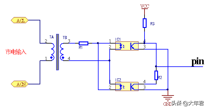 要实现过零其实有很多种方法,有串联两个二极管方法,还可以通过光耦来转换, 如下图,采用两个光耦,交流电输入,两个光耦反向并联,在市电的正负半周两个光耦分别轮流导通,当市电不在过零点时候,只有一个光耦导通,此时输出低电平,当市电转到过零点时候,两个光耦均不导通,此时由于R3作用,pin输出高电平,这样在输出端得到周期为10ms的脉冲信号。由于这种电路由光耦隔离作用,因此这种过零检测电路比串联二极管的那种电路更为更安全。