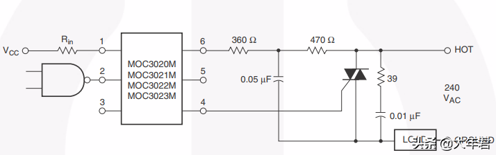 光耦由于在具有单向传输,并且输入端与输出实现了电气隔离,使得输出信号对输入端无影响 ,因此广泛应用于各种隔离电路当中,对于电力电子而言,在交流负载应用的就比较多,通过与双向可控硅一起构成抗干扰能力强的隔离电路,如下图,注意要增加限流电阻,另外在输出负载增加RC吸收回路或者并联一个压敏电阻,这有助于保护负载。