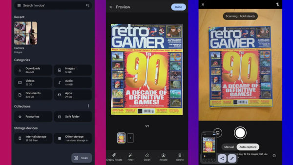 扫描完成后,用户可以裁剪、旋转、清理并对扫描件应用滤镜,应用还允许将多个扫描合并成一个文件。最终,扫描件将以PDF格式保存,并存储在文件应用的“已扫描”标签下的“文档”中;它们也可以在手机存储的“谷歌文件/已扫描”文件夹中找到。