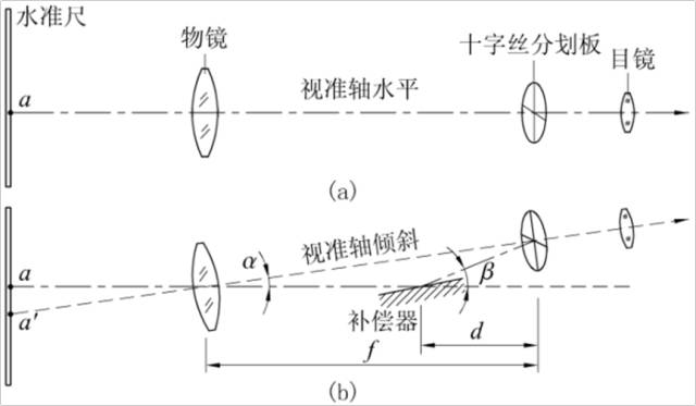 当圆水准器气泡居中后,视准轴仍存在一个微小倾角α,在望远镜的光路上安置一补偿器,使通过物镜光心的水平光线经过补偿器后偏转一个β角,仍能通过十字丝交点,这样十字丝交点上读出的水准尺读数,即为视线水平时应该读出的水准尺读数。
