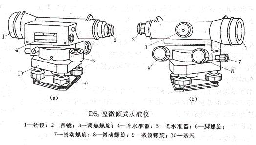 水准仪是提供水平视线的仪器,按精度分,水准仪通常有DS05、DS1、DS3等几种。其中“D”和“S”分别为“大地”和“水准仪”首字汉语拼音的首字母,而下标是仪器的精度指标,即每千米测量中的偶然误差(以mm为单位)。目前常用的水准仪从构造上可分为两大类:利用水准管来获得水平视线的“微倾式水准仪”和利用补偿器来获得水平视线的“自动安平水准仪”。此外,还有一种新型的水准仪——“电子水准仪”,它配合条形码标尺,利用数字化图像处理的方法,可自动显示高程和距离,使水准测量实现了自动化。