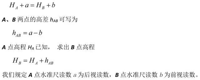如上图所示,设在地面A、B两点上竖立标尺(水准尺),在A、B两点之间安置水准仪,利用水准仪提供一条水平视线,分别截取A、B两点标尺上读数a、b,显然:
