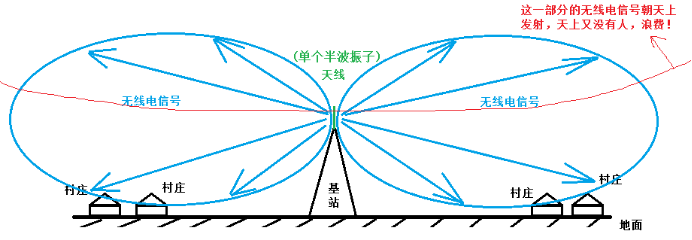 一个 半波振子在垂直面上的半功率角,大至有70度,这个波瓣宽度太大了,我们如果把这个水平等分,那在水平下的部分才能到达地点,被有效利用,而水平线以上的,都在打天空,从能量效能上,浪费很多,这种情况,就类似于全向天线,如下图8