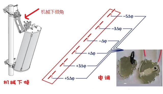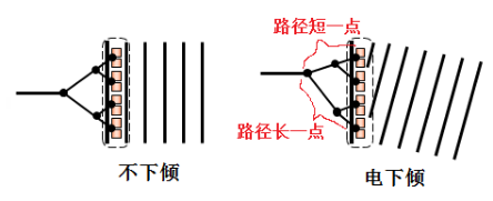 一种是电子下倾角 ,这种方式,是调整信号到达各个振子的时间差,让信号走到上面振子的路径短一点、走到下面振子的路径长一点,这样上面的振子就会提前发信号、下面的振子就会滞后发信号,整个天线发出去的信号就向下倾倾斜了,如图11例,是电子下倾角(electrical tilt)改变。