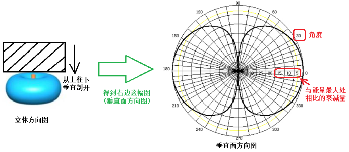 2)方向图 就是把天线在各个方向辐射出去的信号强度画成一幅图,如图5左图。空间是3维立体的,所以方向图也应该是3维立体的。不过立体的虽然看起来形象、好看,但是不精细、不方便读数啊,所以人们一般把立体方向图的水平剖面和垂直剖面画出来,成为水平方向图和垂直方向图,如图5右图。
