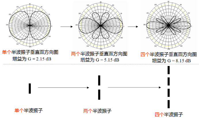 振子数量越多、能量越汇聚、方向图越窄、天线增益越大 ,就如图9的
