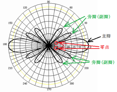 最终形成的天线能量汇聚图10所示,能量最大的方向,为“主瓣”,其他位置会有一些泄露的能量,叫“副瓣”或“旁瓣”;两个瓣之间有一个凹陷点叫“零点”,现在新型的天线都会有”零点填充“,减少塔下黑的情况。