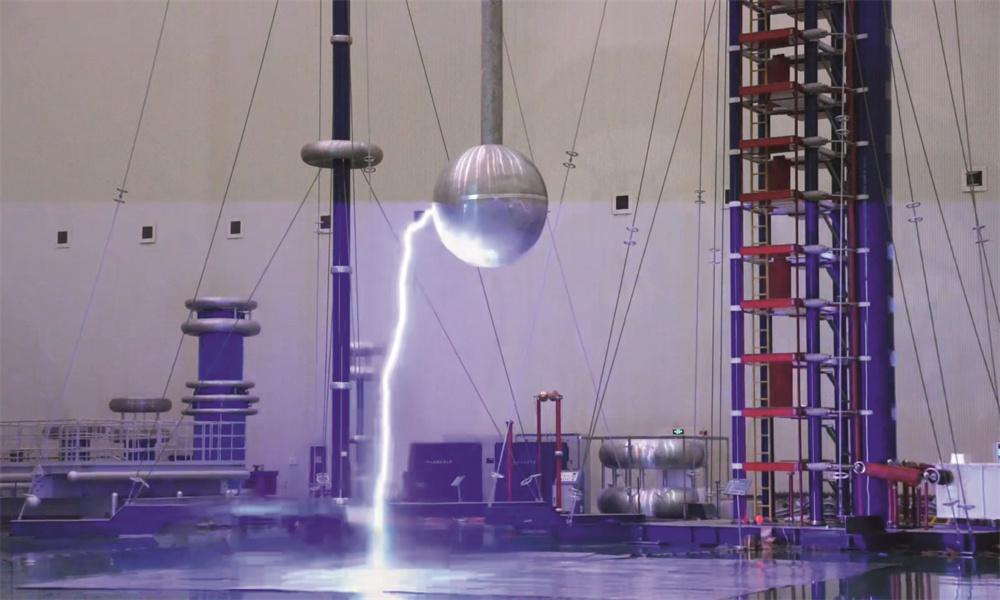 工作人员开展±800千伏特高压换流站阀厅金具对地间隙放电特性试验。摄影 / 朱毅然