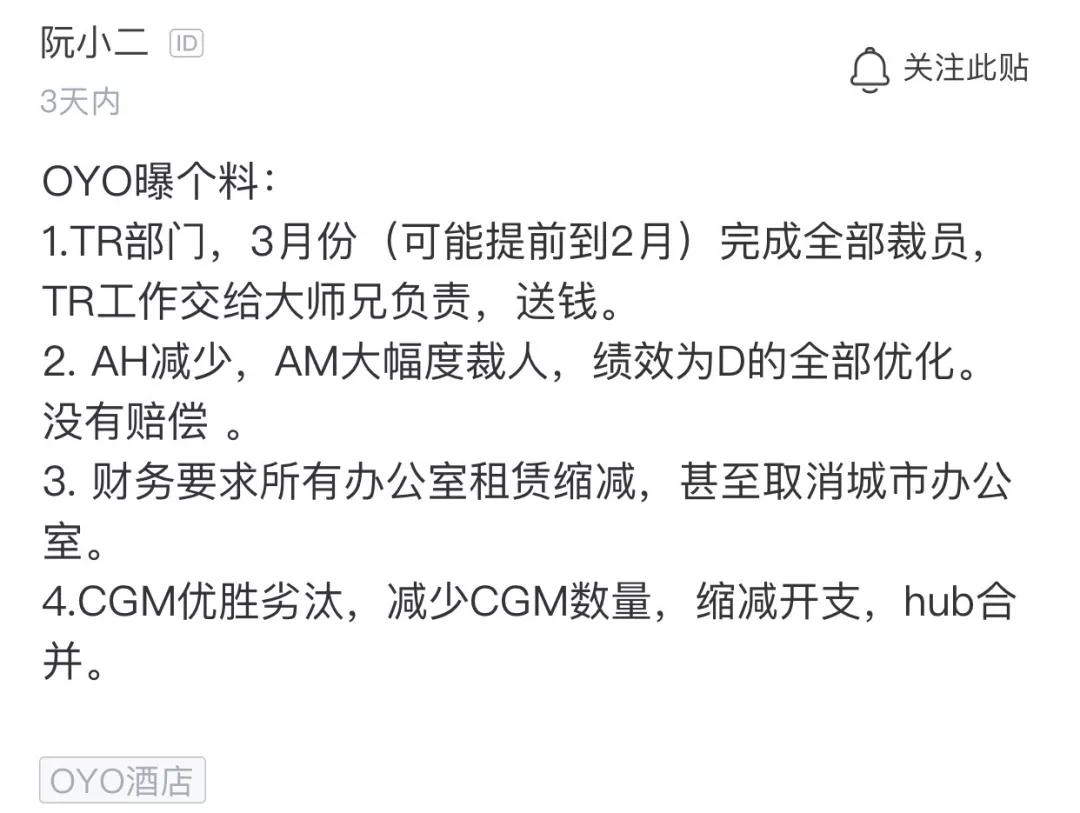 以上是OYO酒店员工近日在社交平台上主动爆料的裁员信息,对于信息真实性,OYO官方未对《IT时报》记者正面回应。