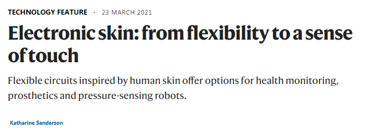 就在最近,知名学术期刊 Nature“科技特写”(Technology Feature)专栏中,一篇题为 Electronic skin: from flexibility to a sense of touch(电子皮肤:从柔韧性到触觉)的文章复盘了电子皮肤的最新发展及蜕变史。