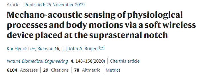 2019 年 11 月,John A. Rogers 团队发表研究成果,展示了一种可蓝牙连接的聚合物电路设备。将这种设备放在喉咙底部凹陷处,就可以实现对说话、心率等生命体征的实时监控,或是对患有中风的人群提供言语治疗。