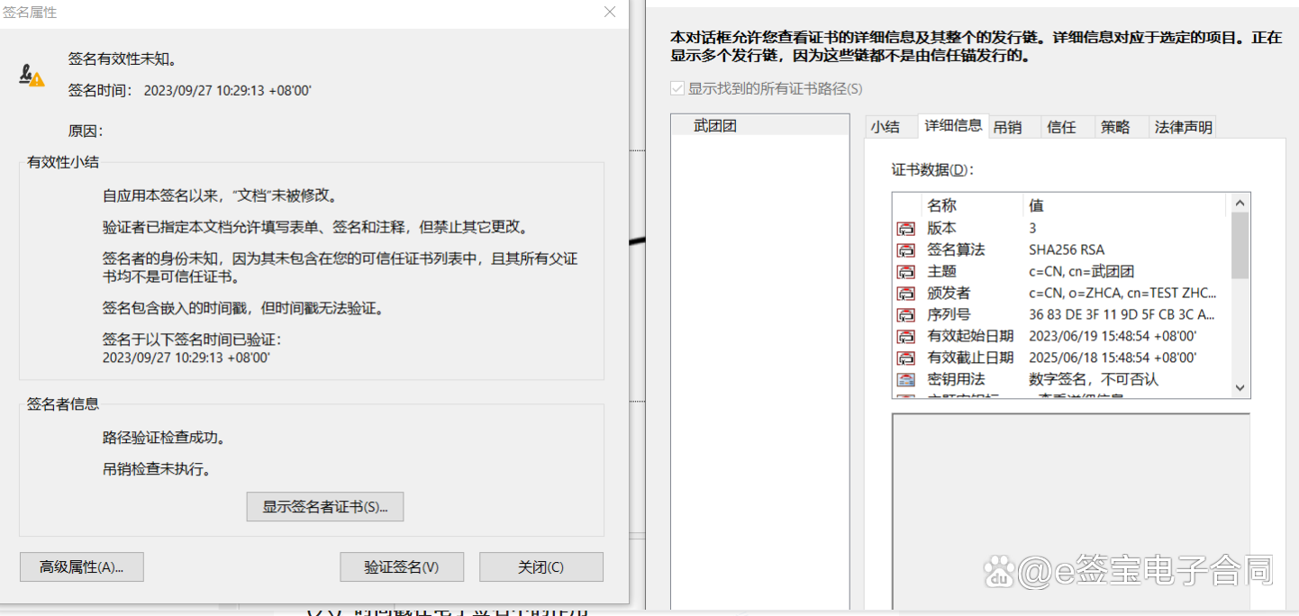 例如,此PDF的签章结构体中包含证书信息,此证书颁发机构为ZHCA,为中环CA,一般来说可以通过证书信息判定签署人信息,但是证书制发链路如果不完整则存在证据链缺失。