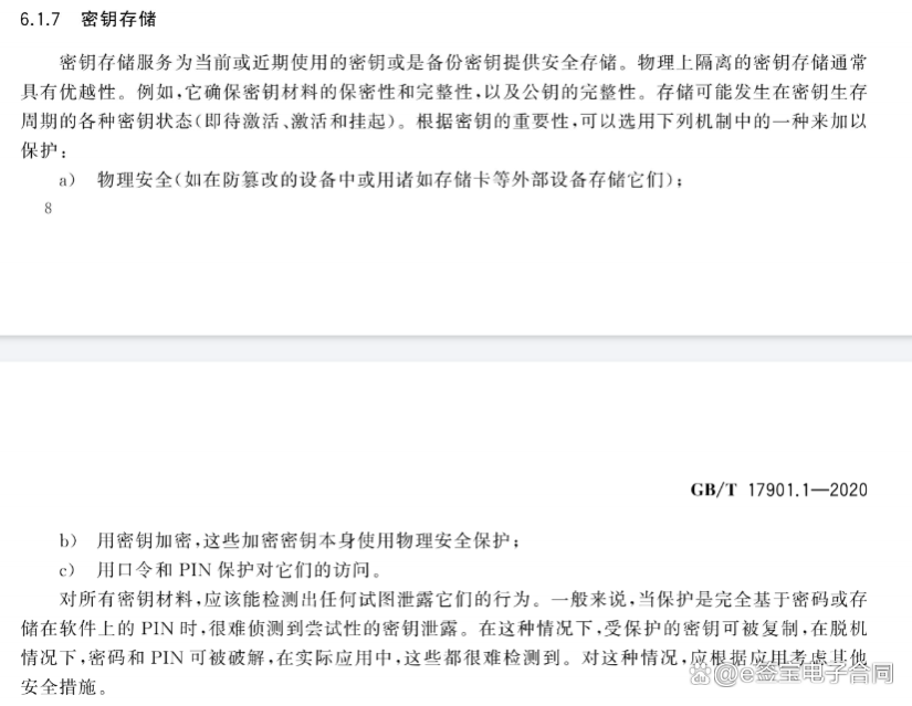 密钥是非对称密码算法的关键要素,分为公钥和私钥,私钥由签署人专属控制,公钥用于申请数字证书对外证明个人身份。目前国密局对于密钥存储与使用有较多安全要求,如GB/T 17901.1-2020《信息技术 安全技术 密钥管理》中会要求密钥必须安全的存储与保护,具体要求如下: