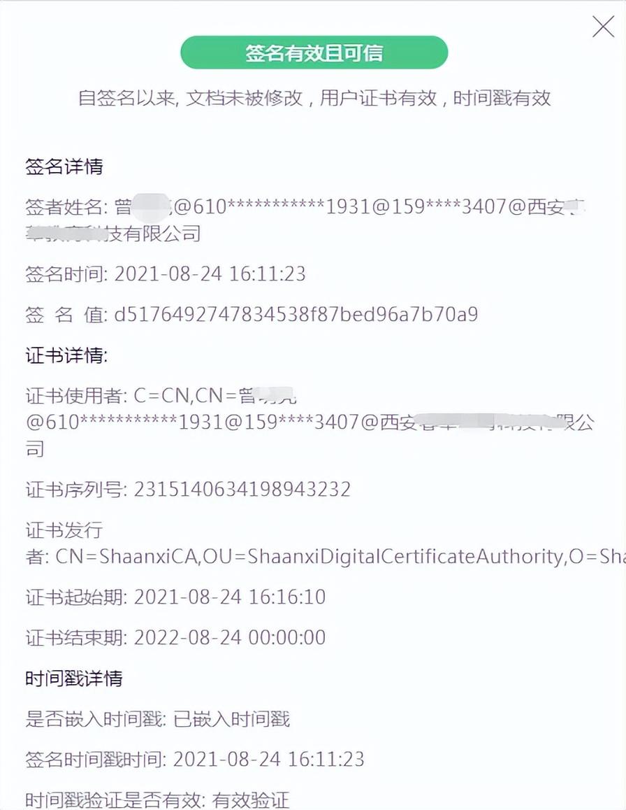 从密码设备中生成的密钥,将公钥与证书申请信息组装发送至CA进行签名后,即可获得数字证书。数字证书在电子签名中主要用于证明当前签署人的身份。CA证书的有效性非联网下仅可依据有效期判断有效性,联网情况下可通过CA机构得知数字证书的有效性。