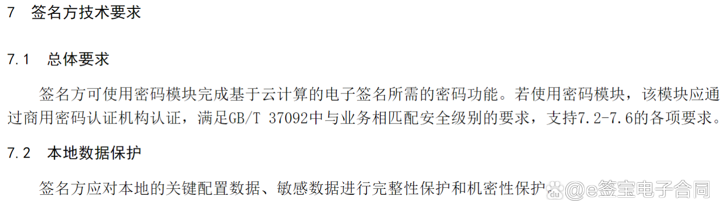 e签宝签署目前主要参考GM/T 0109-2021 基于云计算的电子签名服务技术要求,如采用e签宝的本地化签章产品,则主要参考GB/T 38540《安全电子签章密码技术规范》。