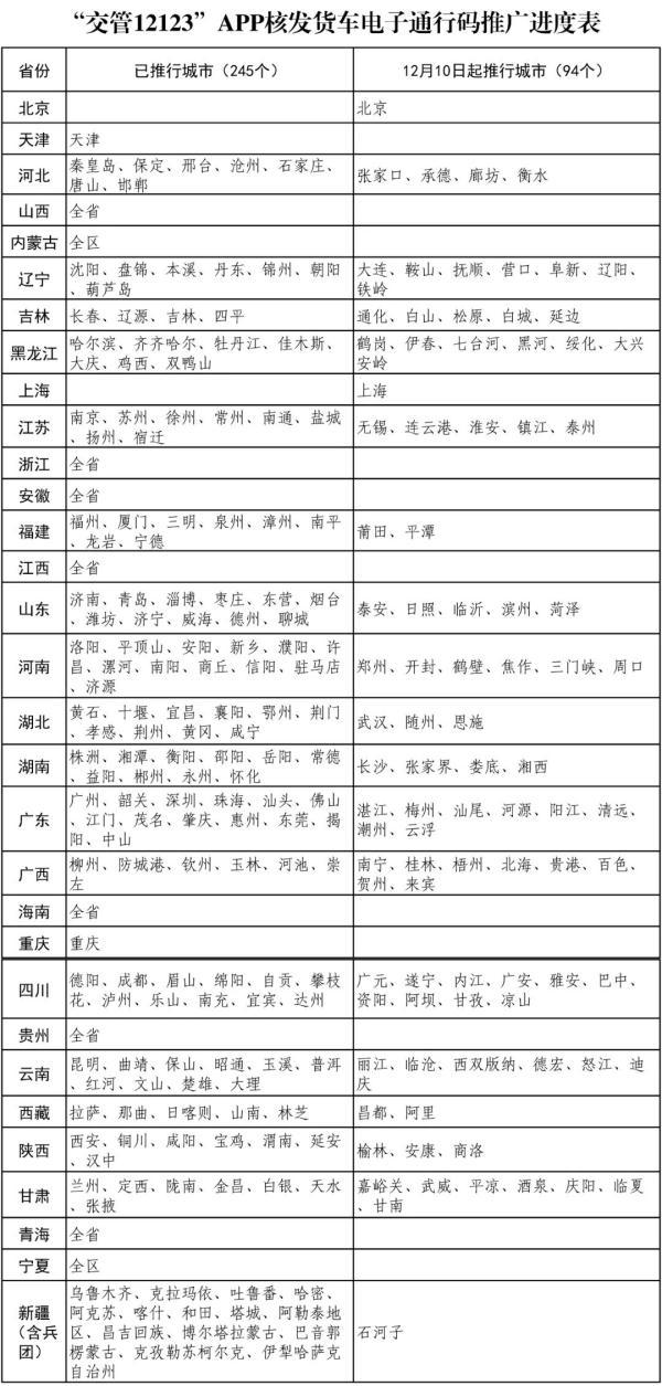 在已覆盖245个城市的基础上,在全国全面推广应用“交管12123”APP网上核发货车通行码。货车驾驶人可直接网上申领、网上出示电子通行码,有效解决货车进城难、办证难等问题。