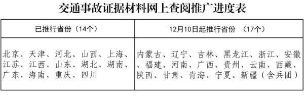 在北京、天津等14个省市推行交通事故证据材料网上查阅的基础上,在其余17个省(区)全面推广应用。交通事故当事人可以通过互联网交通安全综合服务管理平台、“交管12123”APP查阅、复制交通事故现场图、勘查笔录、鉴定意见等证据材料。