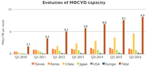 > GaN MOCVD capacity 2010-2016 evolution per region