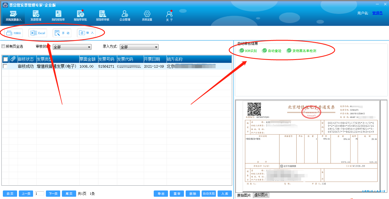 借助“票总管”发票管理系统,自动扫描录入发票明细,一键归档,统一管理电发票影像。财务可随时对发票内容进行检索查询,提升财务效率,合规管理电子发票: