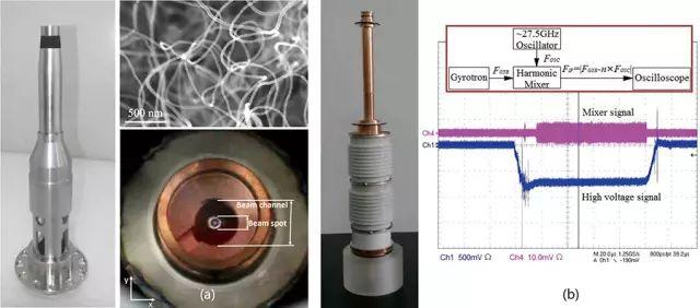 图3 碳纳米管冷阴极0.22太赫兹回旋管,其中(a) 锥柱状碳纳米管冷阴极及其电子枪发射的电子束斑像;(b)碳纳米管冷阴极回旋管及输出测试波形,输出信号频率为0.21985 太赫兹