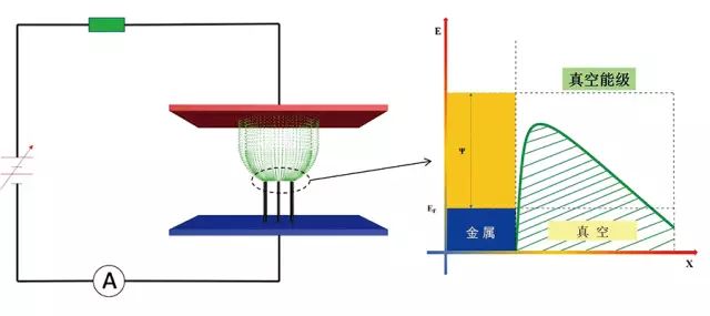 其中,基于场发射的阴极被誉为冷阴极,这是因为场发射是在强电场下固体内部电子跃迁过表面势垒直接进入真空的电子发射,它是一个量子隧穿过程,也是电子在不激发状态下就能进入真空的过程,如图1所示。这样的过程不需要额外能量来激发电子,可在常温下进行,响应速度小于纳秒量级,出射电子具有相同的初速度和方向,电子发射密度高。因此,场发射冷阴极具有功耗低、响应速度快、电流密度大(可达每平方厘米10万安培以上)的优点。该概念自20世纪60年代提出以来,一直被认为是一种理想的电子发射模式。但受限于场发射材料与技术的进展,冷阴极在电子器件中的应用进程一直未得到推进。纳米材料与技术研究的进展,促进了冷阴极的制备技术和性能取得快速发展。同时,纳微结构的场发射冷阴极还具有高分辨率、高响应速度、小型化等特点,采用纳微结构场发射冷阴极电子源是实现阴极和器件性能变革的希望,符合新一代真空电子器件高频率高功率的发展特征。