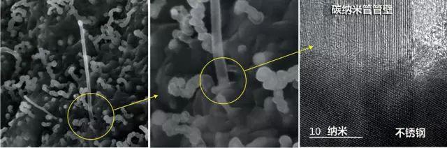 图2 碳纳米管的形貌图及与衬底的接触界面的高分辨显微图像