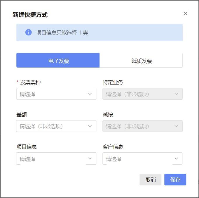 纳税人根据实际需求对不同的发票类型、票种标签、特定业务、差额、减按、项目信息、客户信息等内容进行设置。填写完毕后,点击“保存”,则保存为快捷方式,并展示在“发票填开”的二级首页功能中,后续可直接点击快捷方式进入既定的发票内容页面填写发票信息;点击“取消”,则取消添加快捷方式。