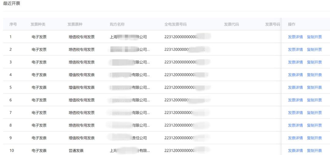 显示纳税人最近开具的10张发票,对于查询所得的发票,可以用于复制开票和查看发票详情,如图5- 2所示。