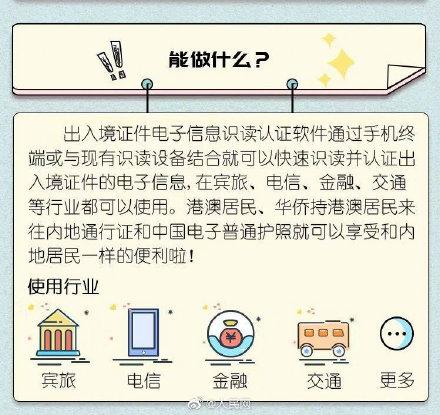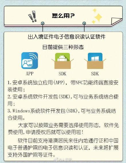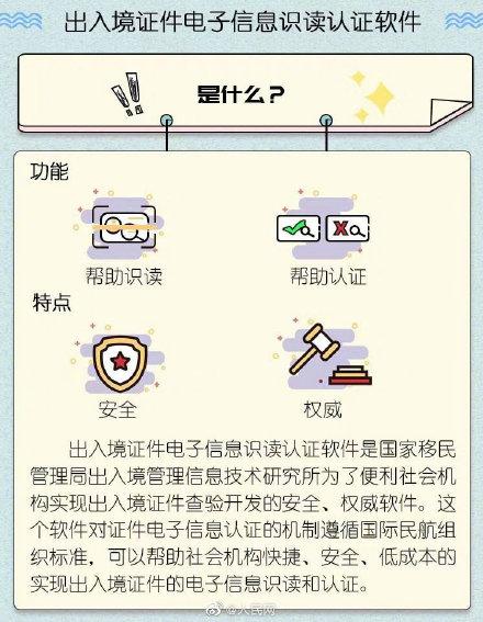 据国家移民管理局出入境管理信息技术研究所介绍,该软件以授权管理方式提供银行、电信、铁路、宾旅业等社会机构免费使用,用户单位可以最低成本实现出入境证件电子信息的识读和认证,为港澳居民、华侨持用出入境证件办理个人事务提供更多便利。软件目前可识读认证中国电子普通护照、港澳居民来往内地通行证两类证件的电子信息,下一步将扩展至外国护照等其他出入境证件。