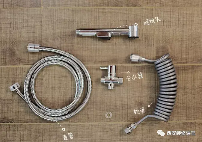 ▲马桶喷枪自带配件,也比较简单,一般只要给马桶跟前安装,只需要更换一个三通角阀即可,喷枪头固定件一般都是免钉的,直接沾墙上即可悬挂喷枪头。需要注意的是自带的管线,分软管和直管,在水压恒定的时候,直管的压力肯定大于软管,但是一般软管要长,这个根据自己需要去购买。如果只是冲洗马桶,直管足够,如果卫生间很大,冲洗的地方多,可以选购两种管路,平时可以根据需求更换。