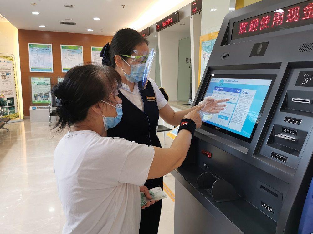 天然气营业厅工作人员协助用户使用燃气现金充值机。通讯员朱炜杰 摄