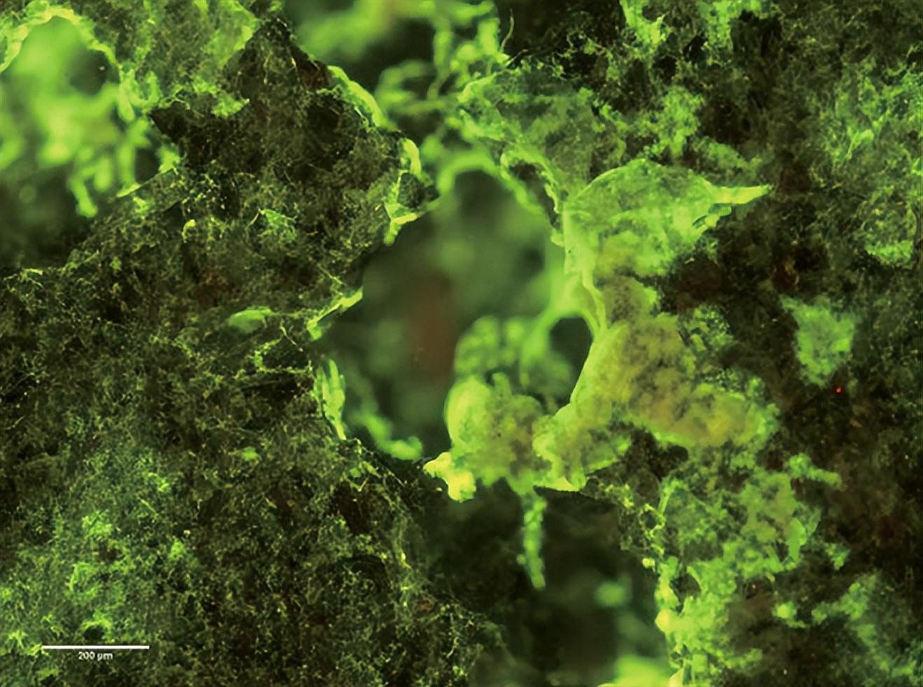 飞行前的生物岩实验中生长在玄武岩上的微生物(图片来源:NASA网站)